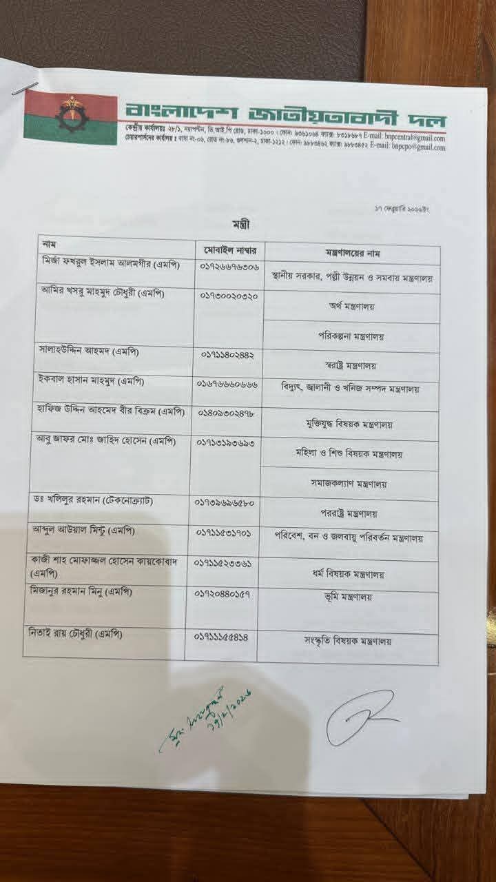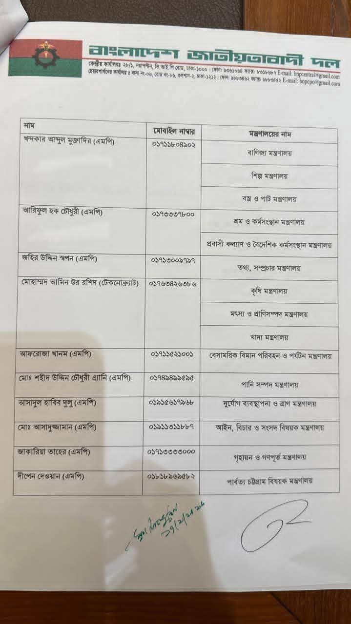 পূর্ণমন্ত্রী হচ্ছেন যারা— মির্জা ফখরুল ইসলাম আলমগীর, আমীর খসরু মাহমুদ চৌধুরী, সালাহউদ্দিন আহমদ, ইকবাল হাসান মাহমুদ (টুকু), হাফিজ উদ্দিন আহমদ, এ জেড এম জাহিদ হোসেন, খলিলুর রহমান (টেকনোক্র্যাট), আবদুল আউয়াল মিন্টু, কাজী শাহ মোফাজ্জল হোসাইন কায়কোবাদ, মিজানুর রহমান মিনু, নিতাই রায় চৌধুরী, খন্দকার আবদুল মুক্তাদীর, আরিফুল হক চৌধুরী, জহির উদ্দিন স্বপন, মোহাম্মদ আমিন উর রশীদ (টেকনোক্র্যাট), আফরোজা খানম (রিতা), শহীদ উদ্দীন চৌধুরী এ্যানি, আসাদুল হাবিব দুলু, মো. আসাদুজ্জামান, জাকারিয়া তাহের, দীপেন দেওয়ান, আ ন ম এহছানুল হক মিলন, সরদার সাখাওয়াত হোসেন (বকুল), ফকির মাহবুব আনাম (স্বপন) এবং শেখ রবিউল আলম।