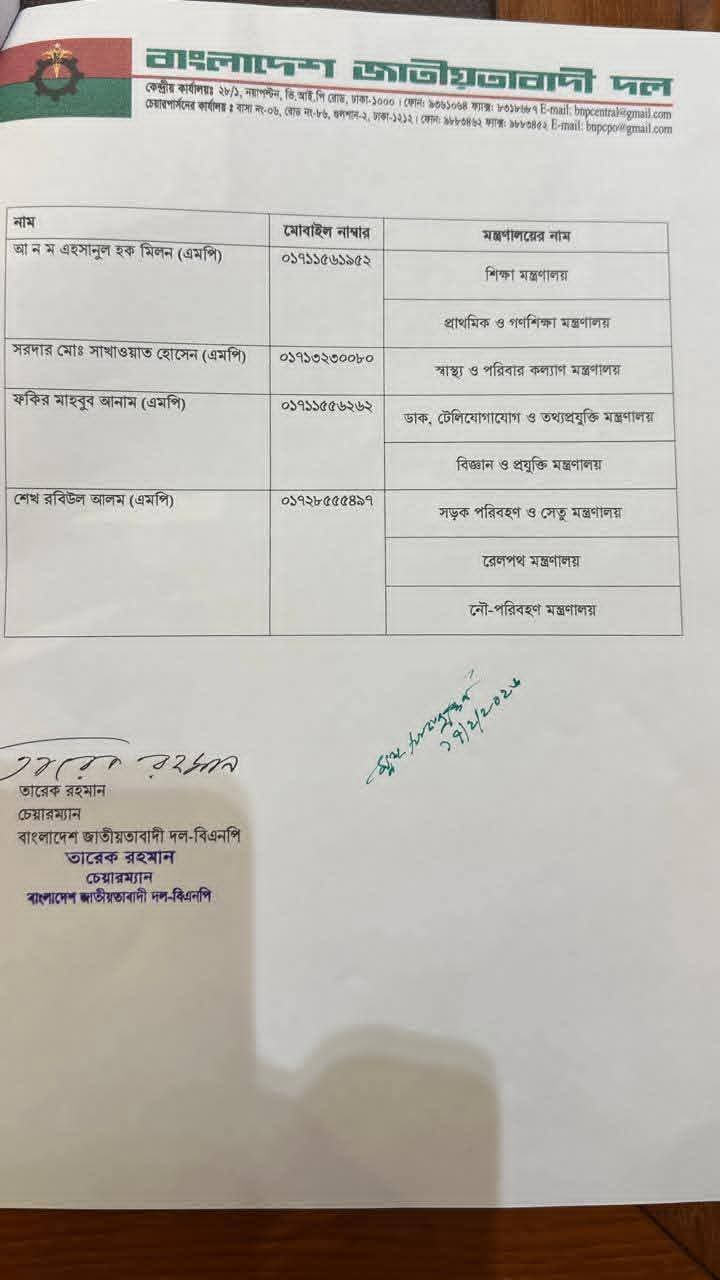আর ঘন্টাখানেক পরেই শুরু হবে মন্ত্রীদের শপথগ্রহণ পর্ব।বিএনপি চেয়ারপার্সন ও বাংলাদেশের নব নির্বাচিত প্রধানমন্ত্রী তারেক রহমানের সরকারের শপথগ্রহণ। প্রতিবেশী দেশ সহ ১৩ টি দেশের প্রেসিডেন্ট, মন্ত্রী, ও কূটনীতিকরা উপস্থিত থাকবেন এই আয়োজনে। রাষ্ট্রপতির নিকট হতে শপথগ্রহণ করবেন নব নির্বাচিত এসব মন্ত্রীগণ।তারেক রহমানের মন্ত্রী সভায় থাকছেন ৪৯ জন মন্ত্রী ও প্রতিমন্ত্রী।