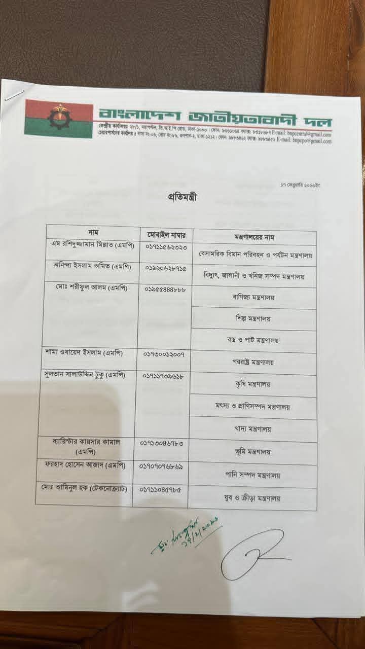 প্রতিমন্ত্রী হিসেবে থাকছেন যারা— এম রশিদুজ্জামান মিল্লাত, অনিন্দ্য ইসলাম অমিত, মো. শরিফুল আলম, শামা ওবায়েদ ইসলাম, সুলতান সালাউদ্দিন টুকু, কায়সার কামাল, ফরহাদ হোসেন আজাদ, আমিনুল হক (টেকনোক্র্যাট), মীর মোহাম্মদ হেলাল উদ্দিন, হাবিবুর রশীদ, মো. রাজিব আহসান, মো. আব্দুল বারী, মীর শাহে আলাম, জোনায়েদ সাকি, ইশরাক হোসেন, ফারজানা শারমিন, শেখ ফরিদুল ইসলাম, নুরুল হক, ইয়াসের খান চৌধুরী, ইকবাল হোসেইন, এম এ মুহিত, আহমেদ সোহেল মঞ্জুর, ববি হাজ্জাজ এবং আলী নেওয়াজ মাহমুদ খৈয়াম।