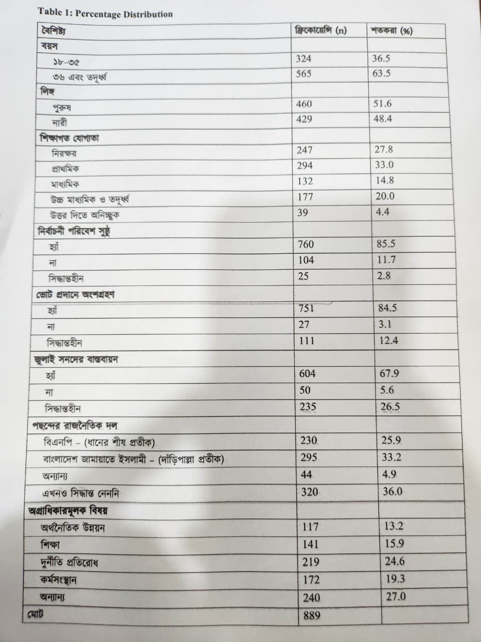 জরিপের তথ্য অনুযায়ী, নির্বাচনে পরিবেশ সুষ্ঠু থাকবে বলে মনে করেন ৮৫.৫ শতাংশ উত্তরদাতা, এই বিষয়ে নেতিবাচক উত্তর দিয়েছেন ১১.৭ শতাংশ এবং কোনো সিদ্ধান্ত জানাননি ২.৮ শতাংশ উত্তরদাতা। আগামী নির্বাচনে ৮৪.৫ শতাংশ জনগণ ভোট প্রদানে অংশগ্রহণ করবেন, অংশগ্রহণে অনিচ্ছুক ৩.১ শতাংশ এবং কোনো সিদ্ধান্ত জানাননি ১২.৪ শতাংশ জনগণ। জুলাই সনদ বাস্তবায়ন চান ৬৭.৯ শতাংশ, এই বিষয়টি চান না ৫.৬ শতাংশ এবং এখনো সিদ্ধান্ত নেননি ২৬.৫ শতাংশ উত্তরদাতা।