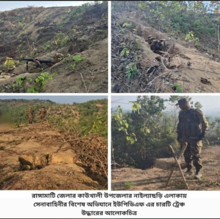 :আজ ভোরবেলা সুনির্দিষ্ট গোয়েন্দা তথ্যের ভিত্তিতে পার্বত্য চট্টগ্রামের রাঙ্গামাটি জেলার কাউখালি উপজেলার কলাপাড়া, নাইল্লাছড়ি এলাকায় ইউপিডিএফ (মূল) এর শীর্ষস্থানীয় সন্ত্রাসীদের বিরুদ্ধে একটি বিশেষ অভিযান পরিচালনা করে বাংলাদেশ সেনাবাহিনী। অভিযানের সময় ইউপিডিএফ (মূল) সন্ত্রাসীদের একটি গোপন আস্তানার সন্ধান পাওয়া যায়। সেনা সদস্যদের উপস্থিতি টের পেয়ে সন্ত্রাসীরা দ্রুত পালিয়ে যায়। পরবর্তীতে উক্ত আস্তানা থেকে সশস্ত্র সন্ত্রাসীদের তৈরি ৪টি রাইফেল ট্রেঞ্চ, ৩টি পর্যবেক্ষণ চৌকি এবং ৩টি বিশ্রাম এলাকা ধ্বংস করা হয়। ইউপিডিএফ এর সশস্ত্র সন্ত্রাসীদের উৎখাতের লক্ষ্যে উক্ত স্থানে সেনাবাহিনীর একটি অস্থায়ী বেইস ক্যাম্প স্থাপন করা হয়েছে।
